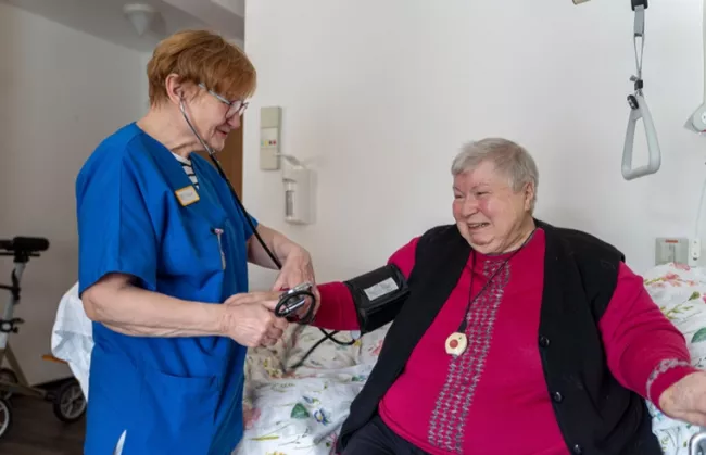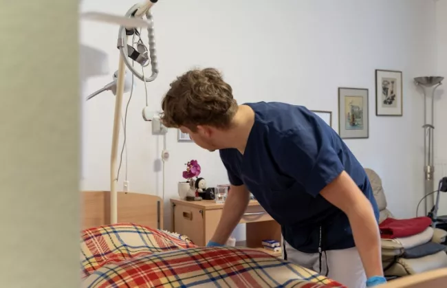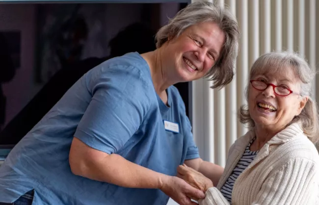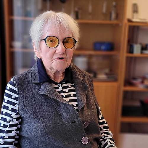„Der Einzug ins Stift war für mich ein großer Einschnitt – nach dem Tod meines Mannes und einer schweren Operation war plötzlich alles anders. Es hat gedauert, bis ich mich zurechtgefunden habe, zumal ich fast blind bin. Aber mit Hilfe des Teams und meiner Cousine ging es Schritt für Schritt. Besonders schätze ich die Dachterrasse, wo ich morgens ohne Hilfe meine kleine Runde drehen und frische Luft tanken kann. Die Physiotherapie und das Sitz-Yoga halten mich beweglich, was für mein Rheuma enorm wichtig ist. Die Küche hat sich mit mir zusammengesetzt und meine vegetarischen Wünsche ernst genommen, das erleichtert mich. Heute bin ich froh, dass ich hier wohne und dankbar, dass ich mir ein Stück meiner Selbstbestimmtheit bewahren konnte.“
